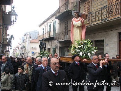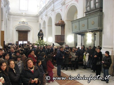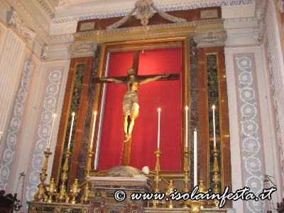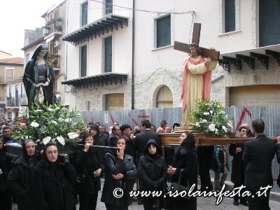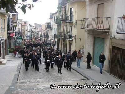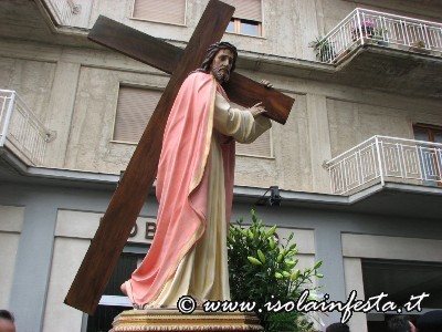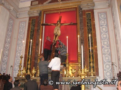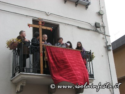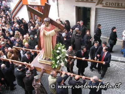 Nella tarda mattinata del Venerdì il lungo corso che congiunge la punta estrema della Città con la Chiesa Madre si trasforma in Golgota purificatore per accogliere la Via Crucis cittadina: pur mantenendo l’impostazione tradizionale le stazioni ogni anno sono affidate a categorie differenti che con le loro ansie e preoccupazioni, sofferenze e angosce rendono attuale il messaggio salvifico della Croce. A mezzogiorno in punto le statue del Redentore e dell’Addolorata rientrano in Chiesa e un Crocifisso con le braccia e la testa snodabili viene posto in croce dai Sacerdoti: il dislivello tra il luogo della crocifissione e la navata occupata dai fedeli crea l’effetto proprio di un evento che sovrasta gli astanti quasi a incombere con potente forza drammatica. Nel pomeriggio terminata la Liturgia “In Passione Domini”, durante l’ultima predica delle sette parole gli sguardi di tutti sono rivolti al Crocifisso, cui, per mezzo di una cordicella viene fatto abbassare il capo.