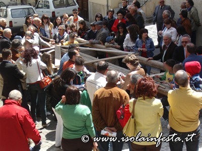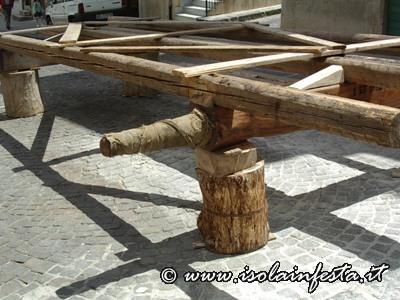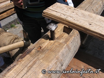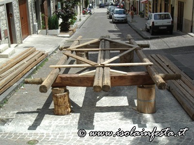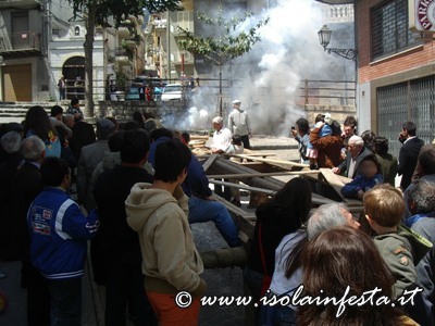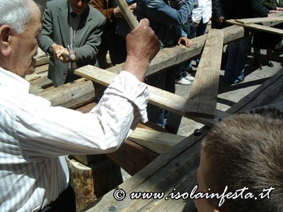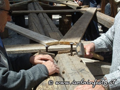 “A chiantata du primu chiuvu” segna l’inizio della costruzione del Carro Trionfale. Questo momento si compie a mezzogiorno della prima domenica di maggio è consiste nell’inchiodare mediante grossi chiodi appositamente forgiati da fabbri locali, le travi lignee che compongono il telaio di base su cui poggia l’intera struttura.