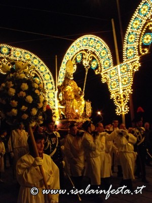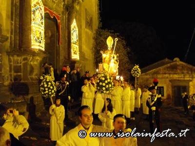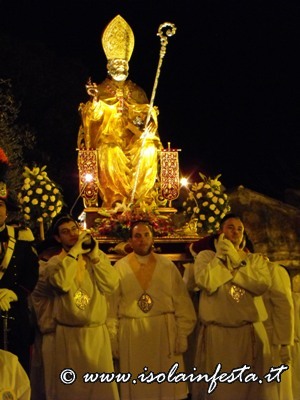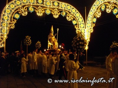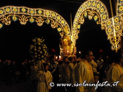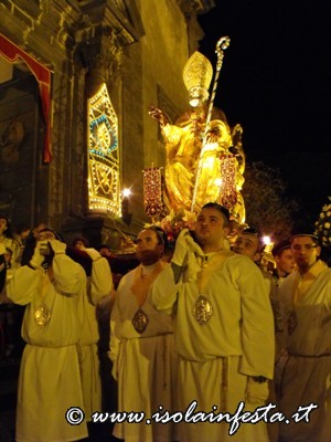 Però a differenza delle altre feste, S. Nicola ha un privilegio: a differenza degli altri Santi che entrano ed escono dalla porta laterale con il fercolo, S. Nicola esce a spalla dalla porta maggiore della chiesa; è l’unico Santo che ha questo privilegio, e per far questo viene portato a spalla.