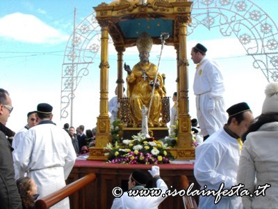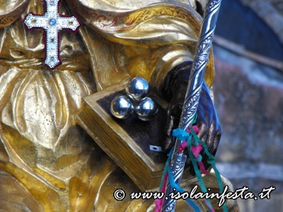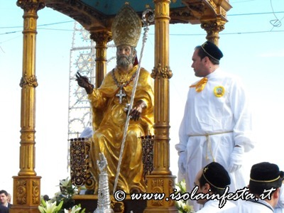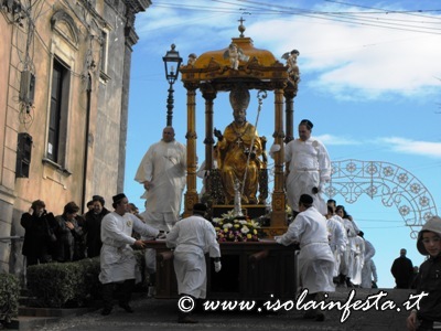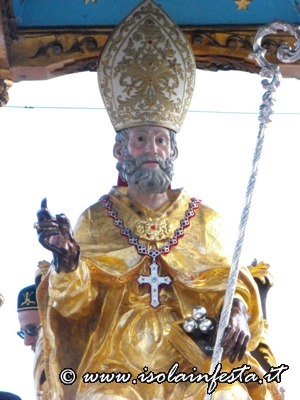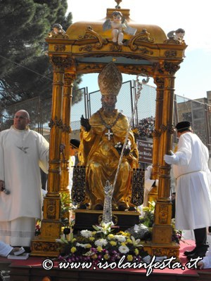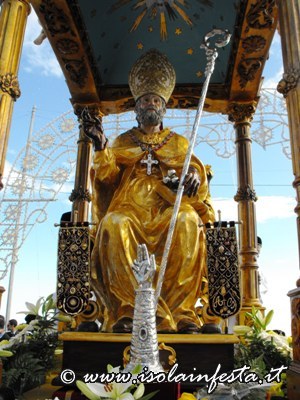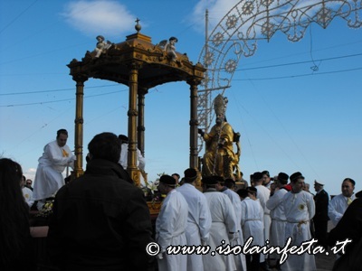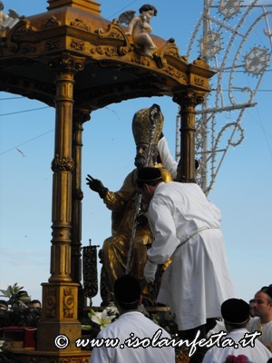 Però a differenza delle altre feste, S. Nicola ha un privilegio: a differenza degli altri Santi che entrano ed escono dalla porta laterale con il fercolo, S. Nicola esce a spalla dalla porta maggiore della chiesa; è l’unico Santo che ha questo privilegio, e per far questo viene portato a spalla.
