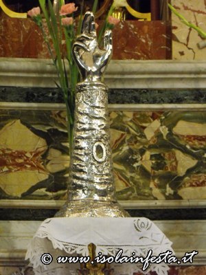 All’offertorio il sindaco, a nome della cittadinanza, offre l’olio per la lampada votiva al Santo Patrono che arderà durante l’anno.