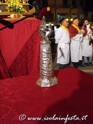 Il venerdì, vigilia della festa, al termine della S. Messa solenne si ha una breve processione della reliquia in chiesa; la processione si conclude davanti alla cameretta di S. Nicola dove avviene la solenne svelata del simulacro, tra gridi di evviva ed applausi.