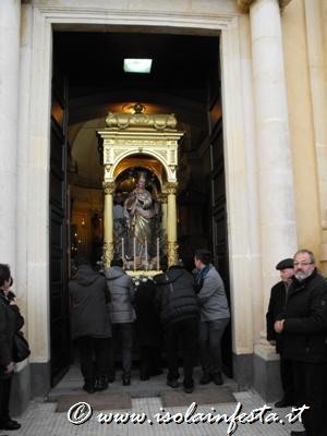 Nel primo pomeriggio il simulacro viene sceso dall’altare e posizionato sul fercolo ligneo ed alle ore 15,00 in punto la Vergine Immacolata fa la sua uscita trionfale dalla chiesa, tra il suono delle campane, il lancio di carte multicolori, suono della banda e l’esecuzione di un assordante spettacolo pirotecnico.