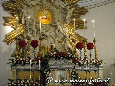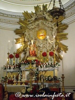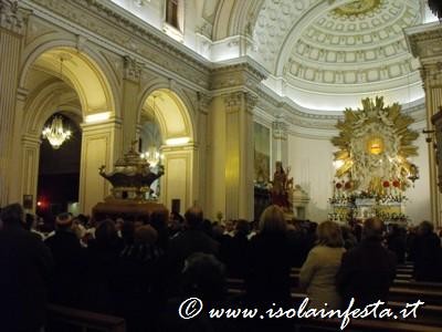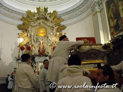 Lungo la navata centrale le invocazioni di giubilo accompagnano la sacra effigie e lo scrigno fino alla stipata navata destra in cui è situata la monumentale cappella. Tolte le “CIAPPETTE” (ganci metallici) che fissano il simulacro al “VAIARDO”, la statua di S. Lucia viene spostata verso il piano della macchinetta. Dopo essere stata elevata all’altezza della porta, l’immagine viene riposta dentro la “CAMMAREDDA” (cameretta).