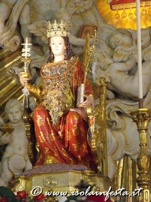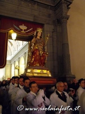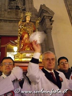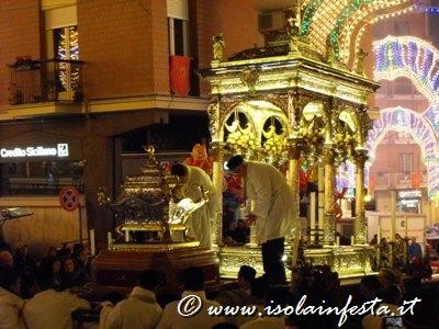 Intorno le ore 18,00 circa l’antica e venerata immagine di S. Lucia  e l’urna reliquiaria fatto la loro uscita trionfale dal portale maggiore della Matrice, accompagnate dallo sparo assordante della “muschittaria”, da uno spettacolo pirotecnico e dal suono festoso di tutte le campane.