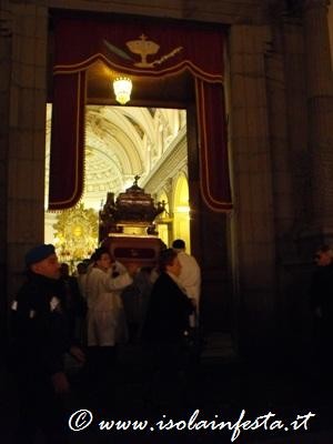 Dopo la benedizione della città con le Sacre Reliquie della Patrona, iniziano le operazione necessarie per posizionare il simulacro e lo scrigno nei rispettivi “VAIARDI” (portantine in legno). Nel breve percorso tra il fercolo ed il portale, la gente si accalca per poter baciare e toccare l’urna reliquiaria e l’immagine di S. Lucia. Dopo lo spettacolo di fuochi artificiali, i due “VAIARDI” fanno il loro ingresso in chiesa.