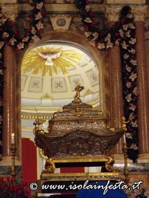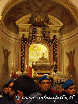 Lungo la navata centrale le invocazioni di giubilo accompagnano la sacra effigie e lo scrigno fino alla stipata navata destra in cui è situata la monumentale cappella. Tolte le “CIAPPETTE” (ganci metallici) che fissano il simulacro al “VAIARDO”, la statua di S. Lucia viene spostata verso il piano della macchinetta. Dopo essere stata elevata all’altezza della porta, l’immagine viene riposta dentro la “CAMMAREDDA” (cameretta).