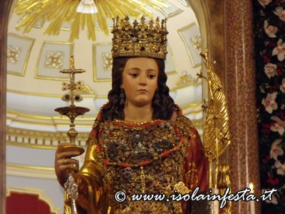 Intorno le ore 18,00 circa l’antica e venerata immagine di S. Lucia  e l’urna reliquiaria fatto la loro uscita trionfale dal portale maggiore della Matrice, accompagnate dallo sparo assordante della “muschittaria”, da uno spettacolo pirotecnico e dal suono festoso di tutte le campane.