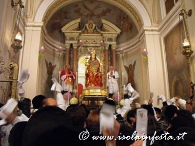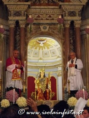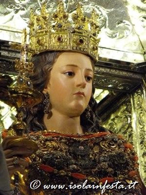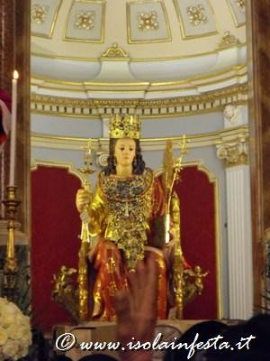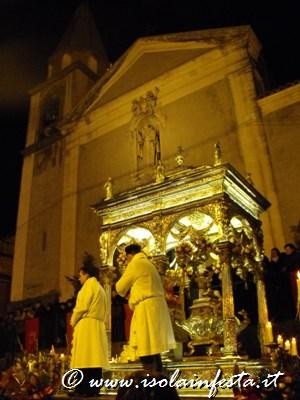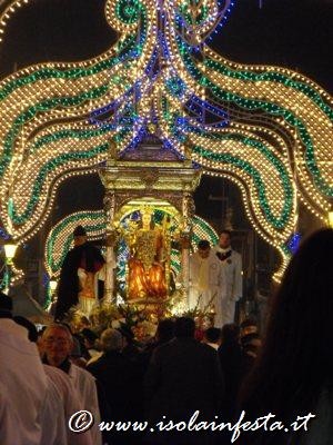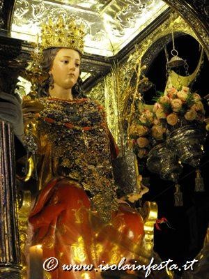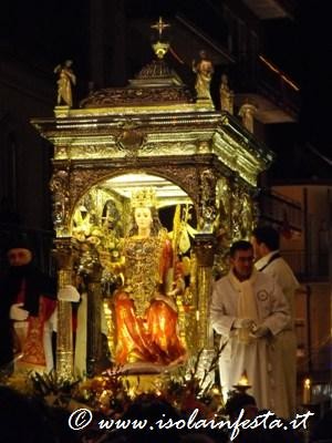 Intorno le ore 18,00 circa l’antica e venerata immagine di S. Lucia  e l’urna reliquiaria fatto la loro uscita trionfale dal portale maggiore della Matrice, accompagnate dallo sparo assordante della “muschittaria”, da uno spettacolo pirotecnico e dal suono festoso di tutte le campane.