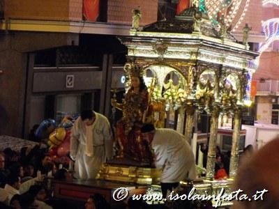 La settecentesca macchina processionale ripercorre il basolato lavico della via Roma, tirata mediante due lunghi “lazzi” (corde), da numerosi devoti che durante i giorni della festa vestono la tradizionale  “CAPPA” bianca, cinta da un cordone, e indossano la “SCUZZITTA” (caratteristico copricapo nero in velluto con nastrino verde).