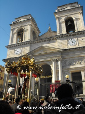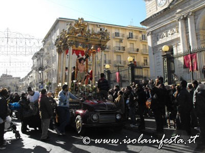Verso le 18,00 il fercolo con il simulacro di S. Sebastiano dal monumento ai caduti di corsa viene portato in piazza Duomo per lo sparo di fuochi d’artificio; subito dopo il simulacro del Santo rientra in chiesa per il solenne Pontificale. a cui partecipano le autorità civili e militari del paese.