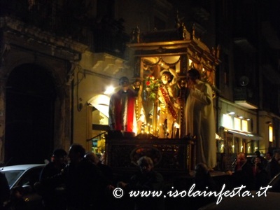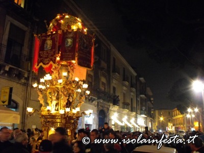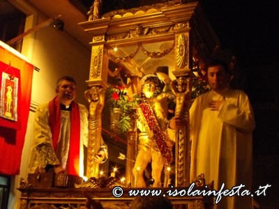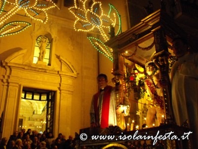 L’uscita del Santo dalla chiesa è salutata dal suono a distesa delle campane, dal lancio di carta multicolore, e dai fuochi d’artificio.