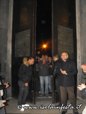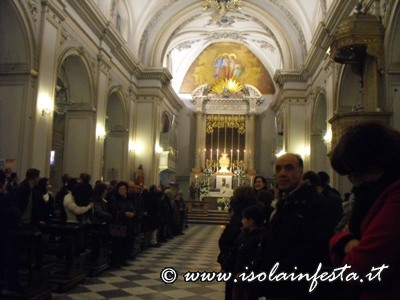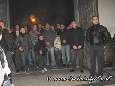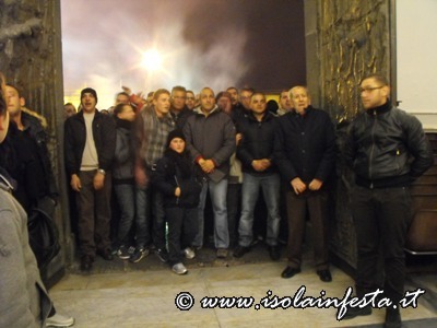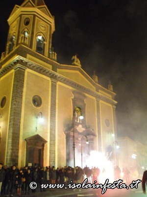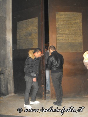 Ad un tratto il portale si apre e i ragazzi, rimanendo li davanti alla porta, continuano a gridare mentre tutto il fumo della fiaccole entra dentro la chiesa; i gridi di evviva sono gli stessi che si fanno durante la prima “Svelata” del 10 maggio alle ore 9,00.
