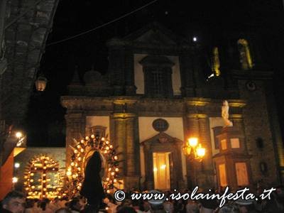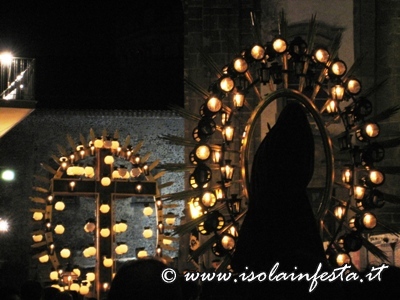Il Cristo Crocifisso viene accompagnato dalle confraternite e sopratutto da sua Madre, Maria Addolorata, posta anch’essa su un fercolo simile a quello del SS. Crocifisso, con grande raggiera con lumini.