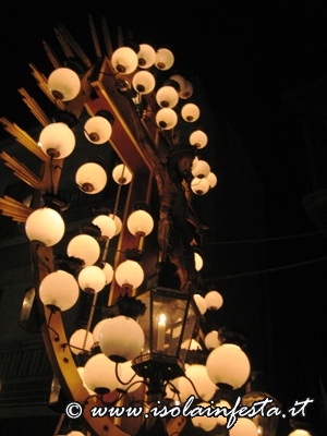 Il simulacro viene sistemato su un particolare fercolo a spalla con una grande raggiera provvista di bocce al cui interno vengono accese delle candele, dando una particolare atmosfera al Crocifisso stesso.