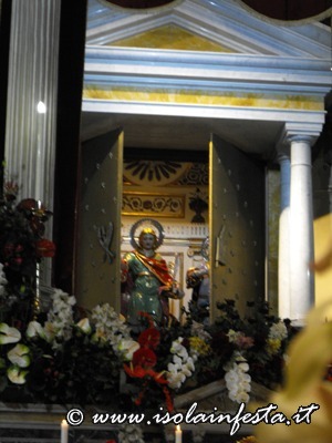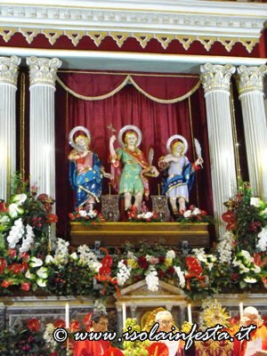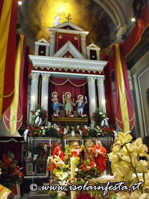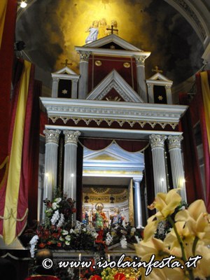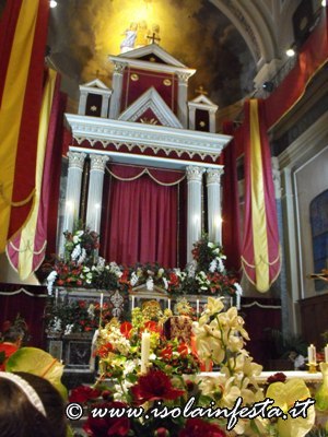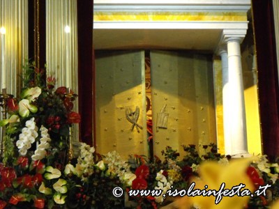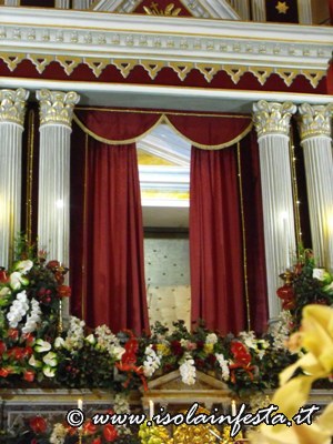 I Santi dopo la svelata vengono lentamente avanzati sull’artistico e meraviglioso altare maggiore in cartapesta allestito per l’occasione e riccamente addobbato da fiori per la recita dei Vespri solenni.