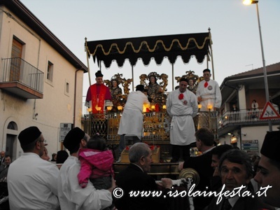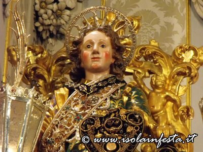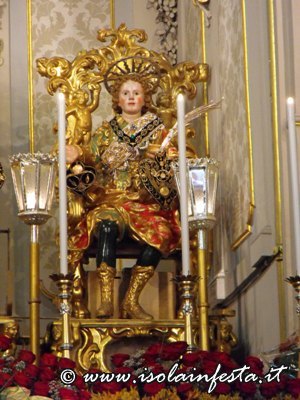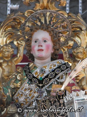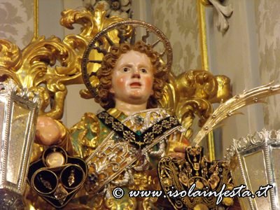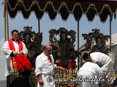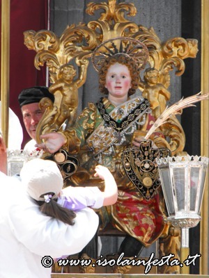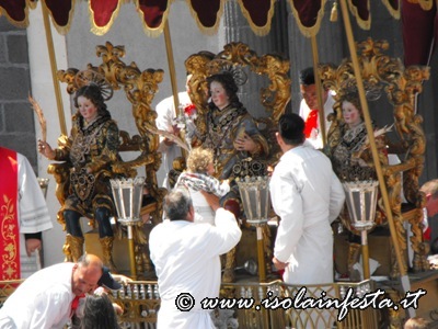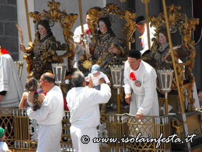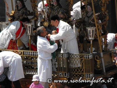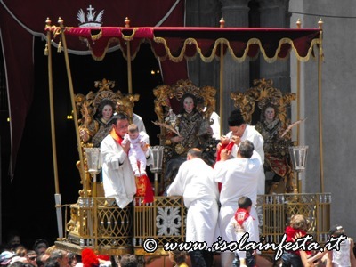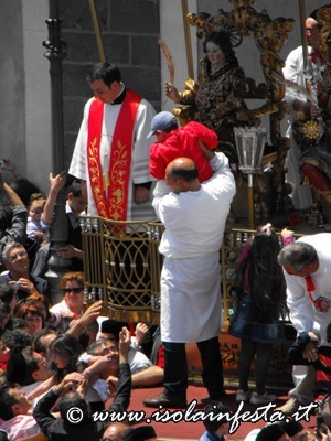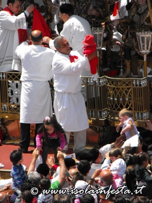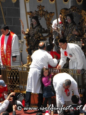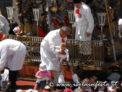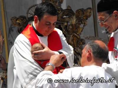 Molti di loro indossano un abitino rosso, quindi vengono spogliati da questo abitino, che viene donato ai Santi per una grazia ricevuta, e vengono avvicinati ai Santi per il bacio, molti, i più grandicelli, vengono messi in piedi davanti ai Santi per fargli baciare le ginocchia perchè data la loro altezza minuta arrivano a baciare proprio le ginocchia.