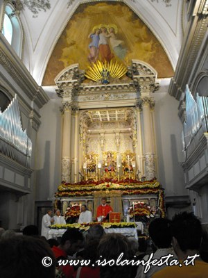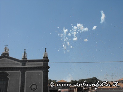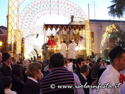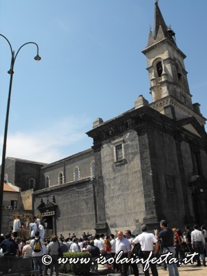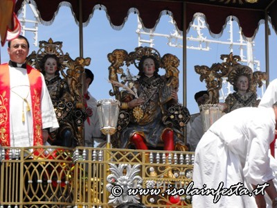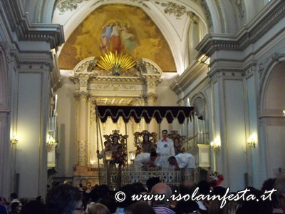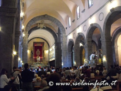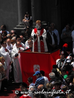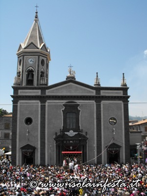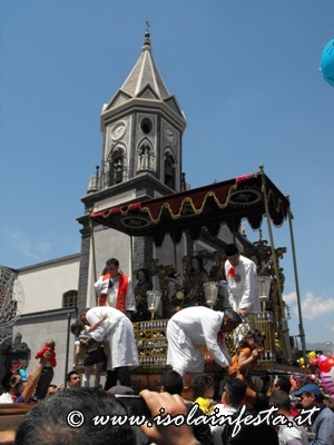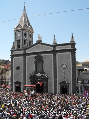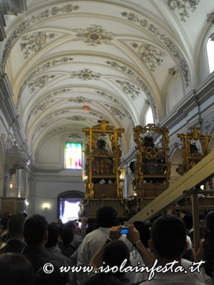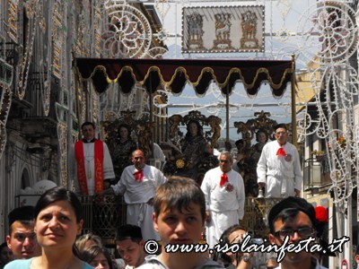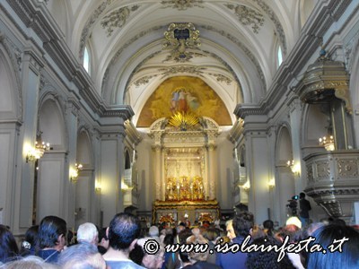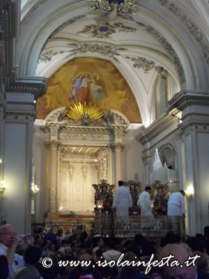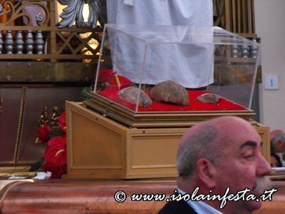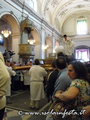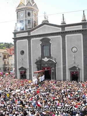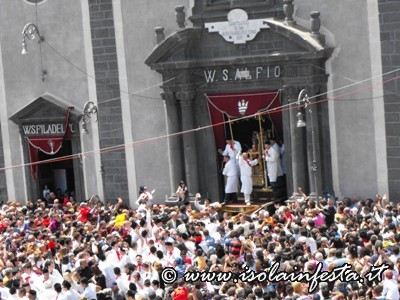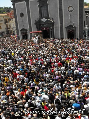 La confusione accresce sempre di più fino al punto che la gente esce fuori la porta del Santuario ed il fiume di gente arriva fino alle case che si trovano di fronte al sacrato, dall’altro lato della piazza, perchè ai più ritardatari, non avendo la possibilità di entrare in chiesa, gli rimane solo l’opportunità di vedere la svelata dall’esterno, perchè i Santi Martiri si riescono a vedere fin fuori la chiesa, anche da lontano, ed essendoci nella facciata gli altoparlanti, si può seguire la messa ed il momento della svelata anche da dall’esterno, come se uno fosse li presente all’interno della chiesa, con soltanto la differenza di avere un pò di sole in testa o un pò di fresco se il tempo è molto ottimale.
