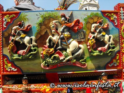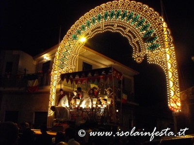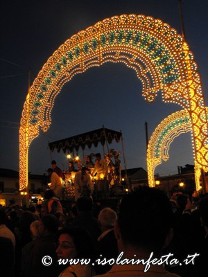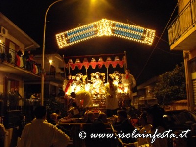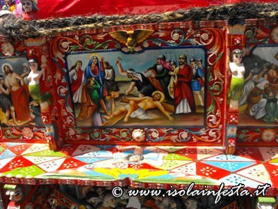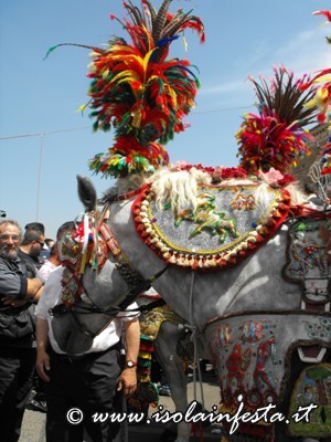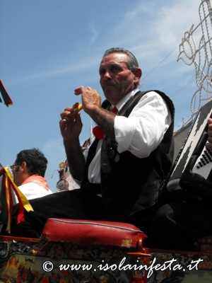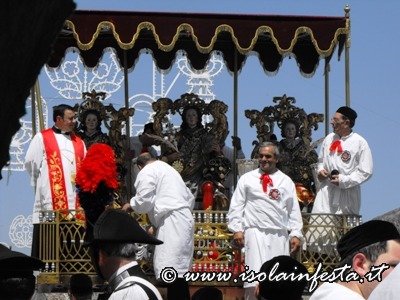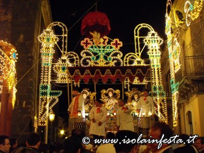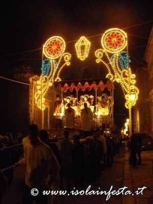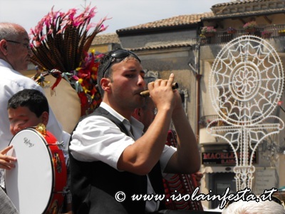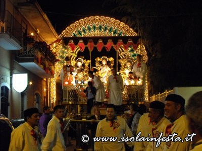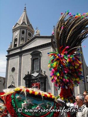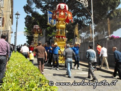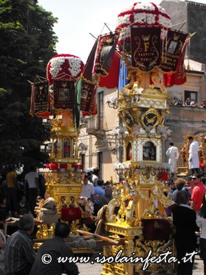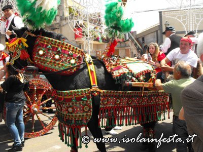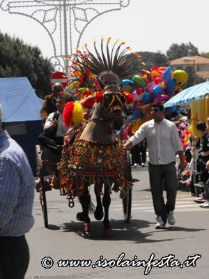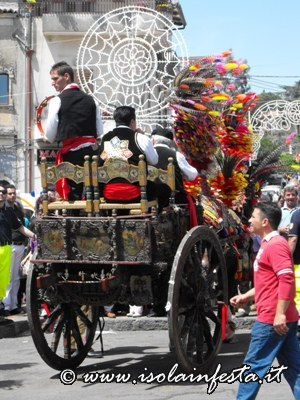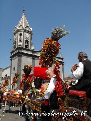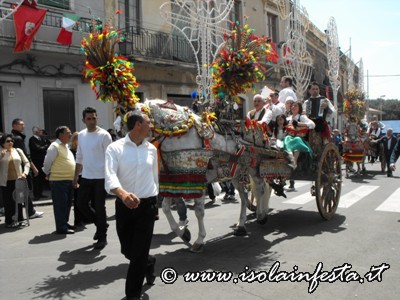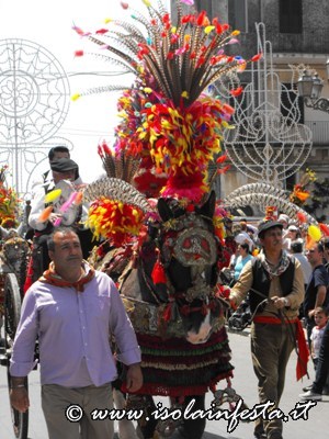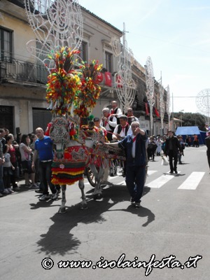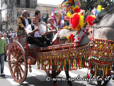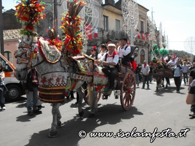 Quello che rimane è soltanto questa sfilata che è un’allegra giostra di colori per grandi e piccini: percorrendo le via del paese i carretti arrivano in piazza ed arrivando davanti la porta aperta del Santuario i cantori che suonano le tradizionali musiche e cantate siciliane recano il loro omaggio ai Santi Martiri suonando e cantando, ed a volte facendo inginocchiare il cavallo.