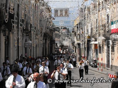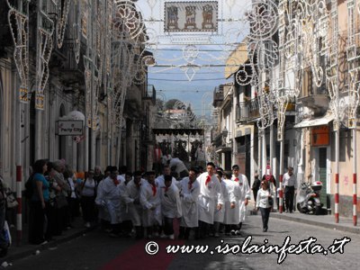 Adesso i Santi Martiri iniziano il loro giro per le vie del paese per arrivare in chiesa madre, e lo fanno percorrendo il Corso Sicilia passando dalla tradizionale ed antica fiera di S. Alfio molto caratteristica.