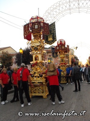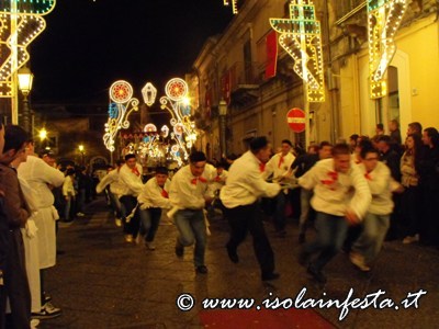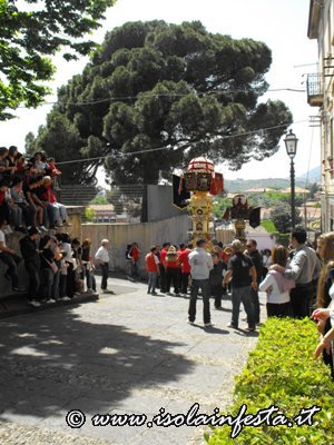 Il fercolo, al suono della campana del “mastro di vara”, parte, e nel giro di pochi secondi percorre la ripida salita, tra gli sforzi e le grida dei tiratori, il suono delle campane e gli applausi dei fedeli spettatori che attendono l’arrivo dei Santi Martiri davanti il sacrato della chiesa madre.