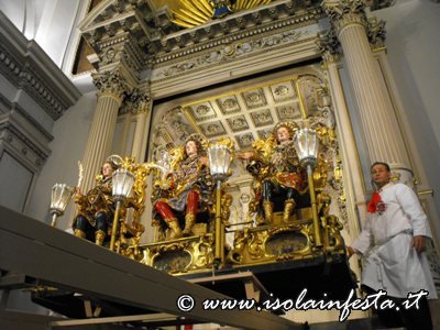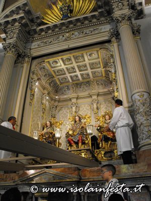 Intanto l’altare viene spogliato da fiori, candelabri e tovaglie per far spazio ai devoti per preparare e montare i due binari che serviranno per far scendere i tre simulacri dalla cameretta fino alla vara posta ai piedi del presbiterio.