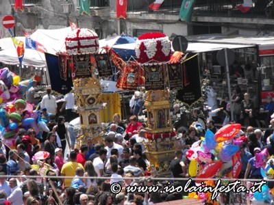 Intanto all’esterno del Santuario si svolgono tutte quelle manifestazioni folkloristiche collaterali che sono rimaste come tradizione: per esempio la sfilata in piazza di numerosi carretti siciliani, antica tradizione di questa festa derivata dal fatto che anticamente, non esistendo le auto, tutti venivano con i carretti; addirittura anticamente veniva svolta la corsa dei cavalli abolita ai giorni d’oggi.