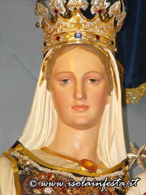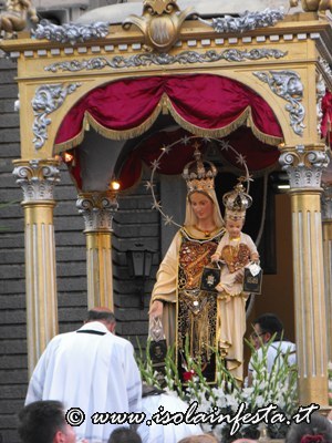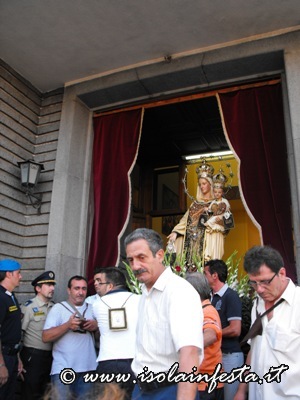 Alle ore 18,30 circa si ha la trionfale uscita della Madonna dalla chiesa, tra il suono delle campane, il lancio di carte multicolori, il suono della banda e lo sparo dei fuochi d’artificio.