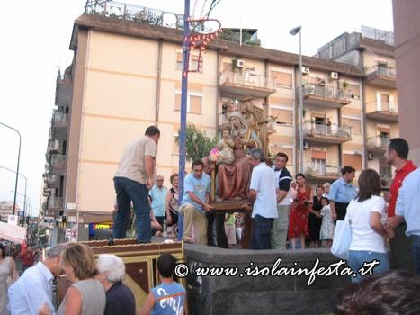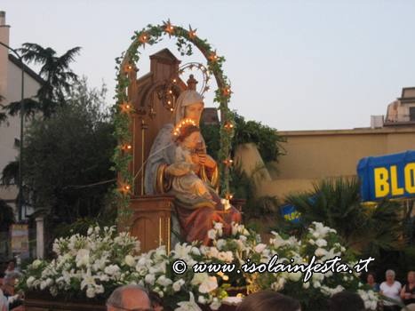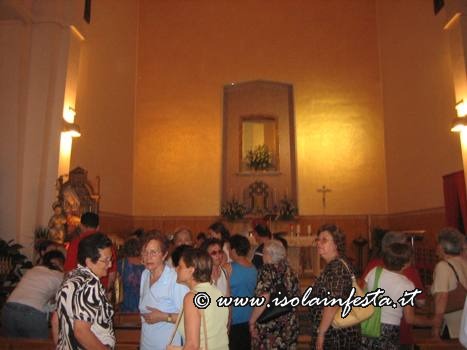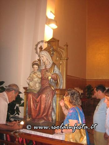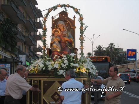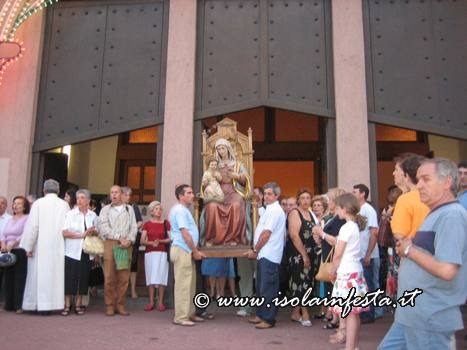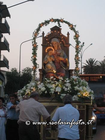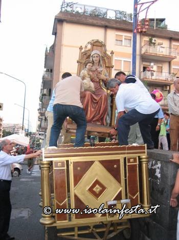 Dopo la S. Messa serale, la Madonna si è affacciata davanti il sacrato intorno alle ore 20,00 circa per essere messa sopra la piccola e semplice vara a quattro ruote riccamente infiorata, senza cordone tirato dai devoti e senza baldacchino.