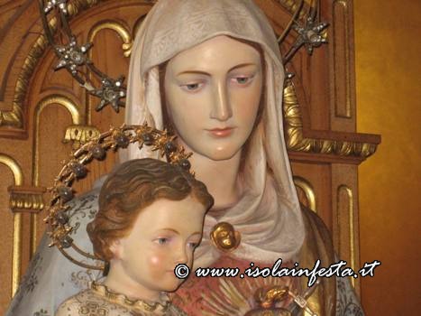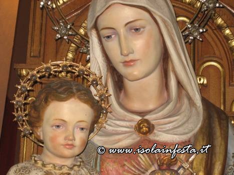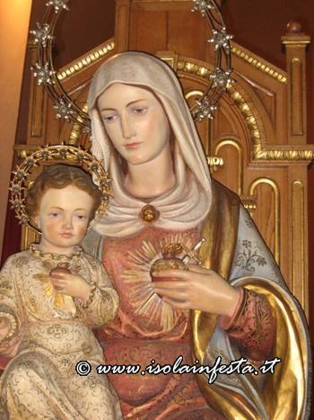 Quindi una chiesa moderna molto graziosa a tre navate, dove in una nicchia sopra l’altare maggiore troneggia tutto l’anno il simulacro del Cuore Immacolato di Maria rappresentato con la Madonna seduta su un trono con il bambinello Gesù tra le sue gambe, e nel petto il cuore trafitto da una spada.