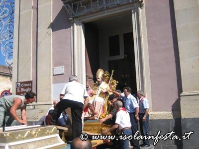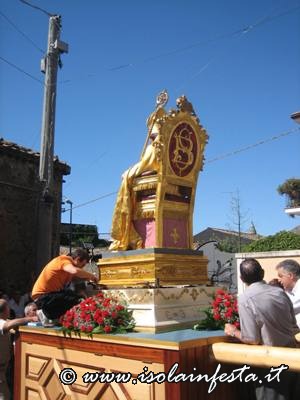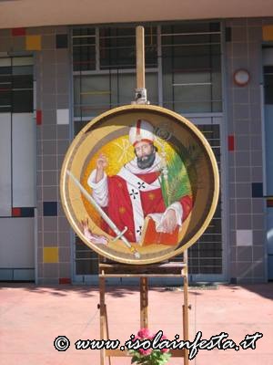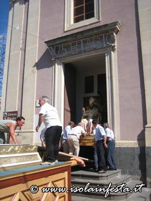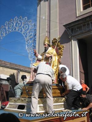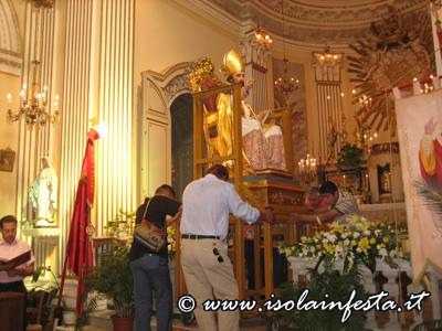 La mattina della domenica, alle ore 9,00 circa il simulacro è uscito dalla sua chiesa e sistemato sul fercolo della Madonna delle Grazie prestato per l’occasione dalla commissione della festa della Madonna (dieci ani fa era stato usato quello di S. Antonio Abate).