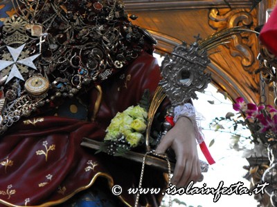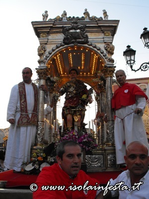 Dopo lo sparo dei fuochi d’artificio, il simulacro di S. Vito viene portato a spalla verso l’artistica vara argentea per poi essere sistemato al suo interno per la processione.
