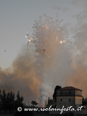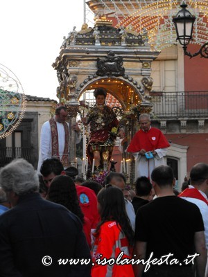 La sera, dopo la S. Messa Solenne, alle ore 19,30 circa il Santo Patrono fa la sua uscita trionfale in piazza, tra gli evviva dei fedeli, lo sventolio dei fazzoletti bianchi, lo scampanio delle campane, il lancio di carte multicolori e lo sparo della “moschetteria” in piazza e il grandioso spettacolo pirotecnico alle porte del paese, proprio di lato alla piazza.