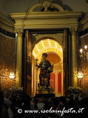 La sera, dopo la S. Messa Solenne, alle ore 19,30 circa il Santo Patrono fa la sua uscita trionfale in piazza, tra gli evviva dei fedeli, lo sventolio dei fazzoletti bianchi, lo scampanio delle campane, il lancio di carte multicolori e lo sparo della “moschetteria” in piazza e il grandioso spettacolo pirotecnico alle porte del paese, proprio di lato alla piazza.