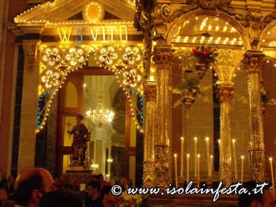 Dopo lo sparo dei fuochi d’artificio, il simulacro di S. Vito viene portato a spalla verso l’artistica vara argentea per poi essere sistemato al suo interno per la processione.