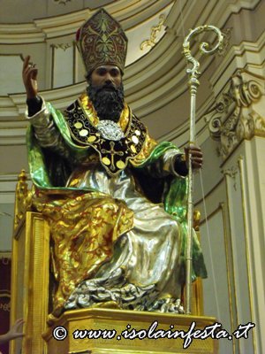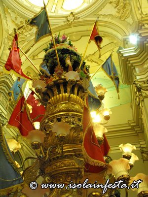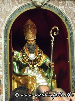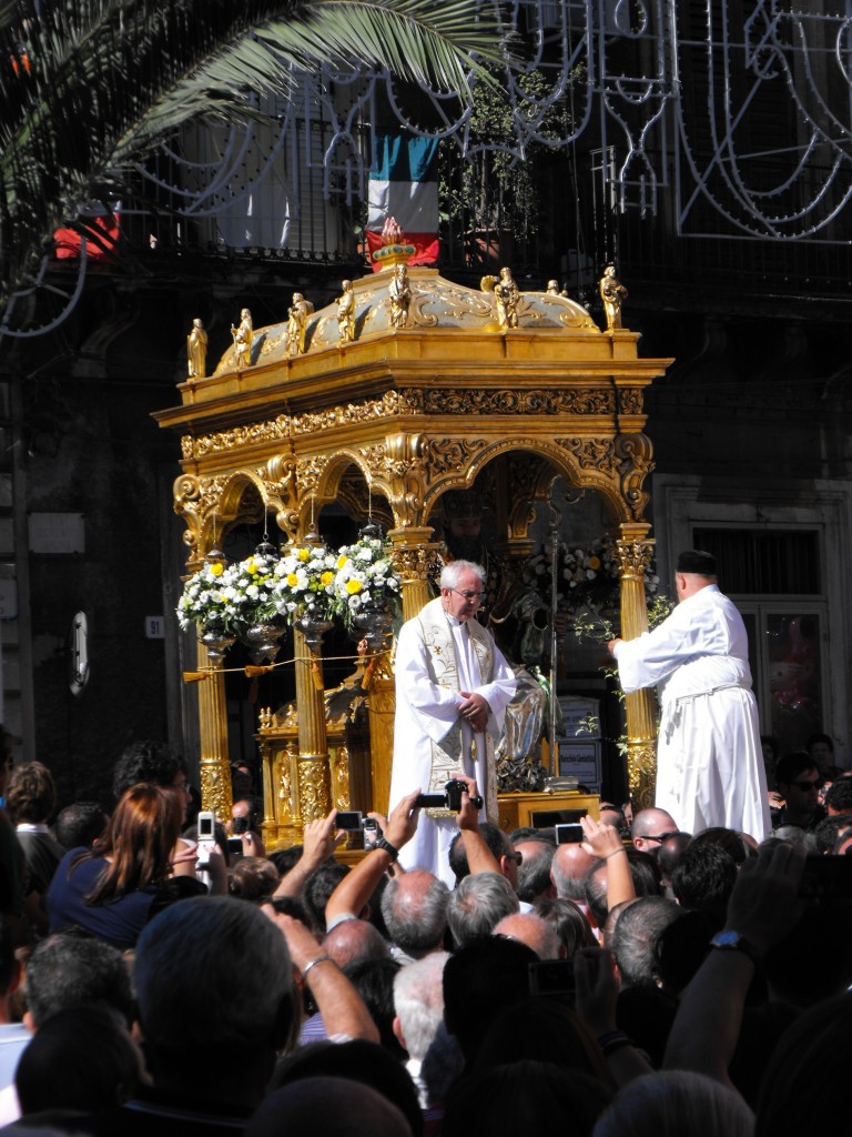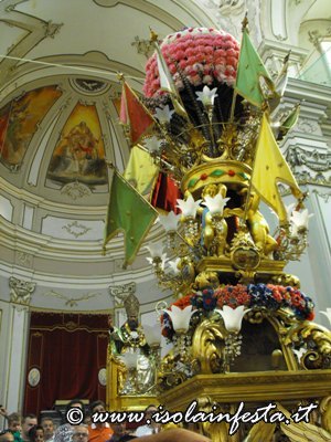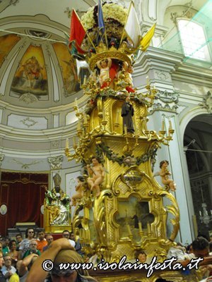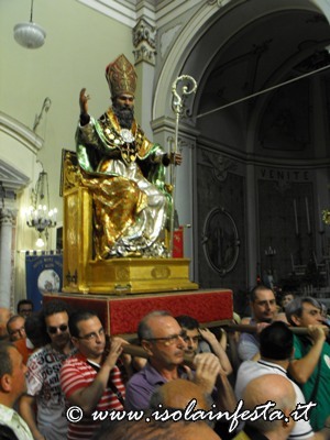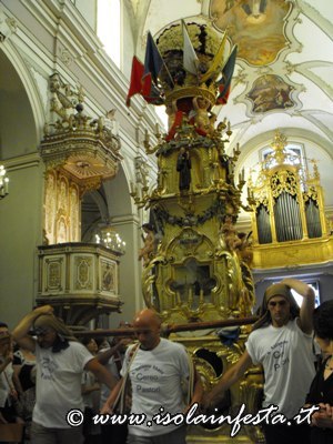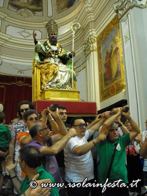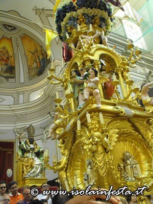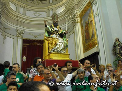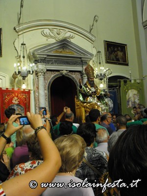 Frattanto nella piazza ci si prepara per l’uscita. Il fercolo, aurea dimora del Santo durante le processioni, viene sistemato in prossimità del portale principale della chiesa, la banda si sistema, il popolo attende con trepidazione il ritorno per le strade del proprio Patrono, volgendo lo sguardo all’altare.