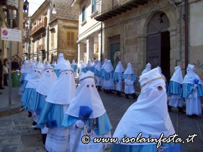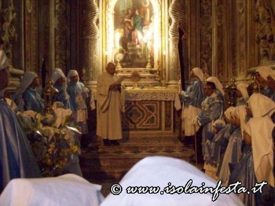 Alle ore 11:00, dal convento di Montesalvo, apre un’altra giornata santa la confraternita di Maria SS. Della Visitazione, la confraternita della Patrona di Enna. La mantellina di colore azzurro è in raso, con a sinistra l’effigie della Santa Patrona, camice bianco a sacco suddiviso in due parti con i bordi merlettati, dello stesso colore della mantella è il tipico scapolare con nastro celeste con ricamata l’effigie della Madonna, e dietro il simbolo mariano M. e A.