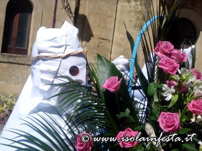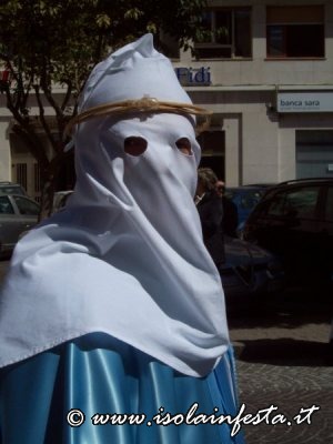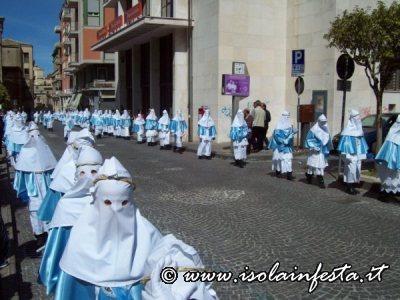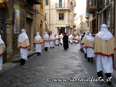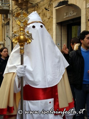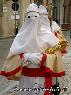 Alle ore 17:00, dalla chiesa di San Tommaso muove la confraternita del SS. Sacramento. Camice bianco, non a sacco, ma aperto sul davanti con bottoni rossi, mantella color latte, bordata con raso rosso, recante a sinistra uno stemma ovale con a rilievo un ostensorio, fascia stretta a vita rossa con frange pendenti sul lato sinistro.