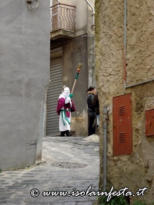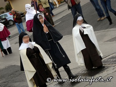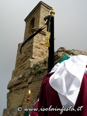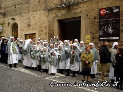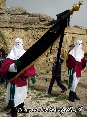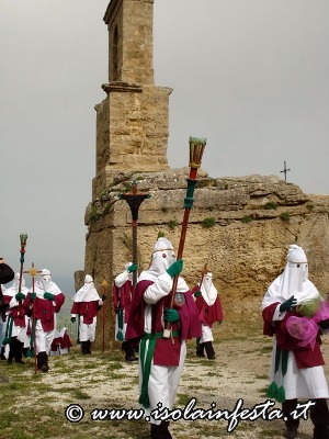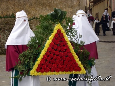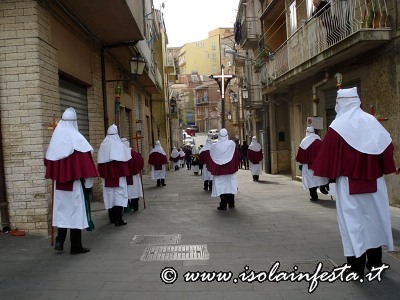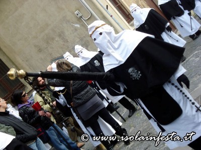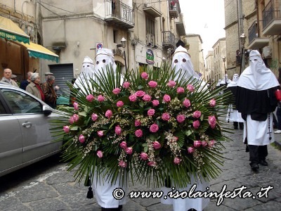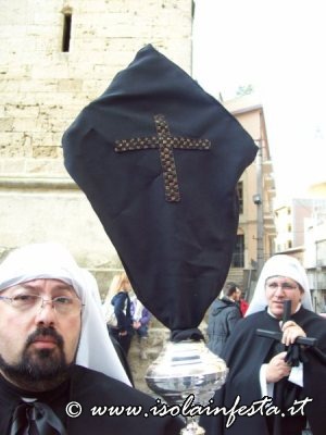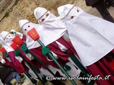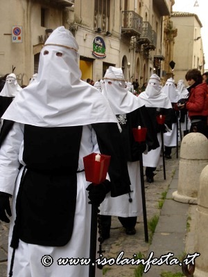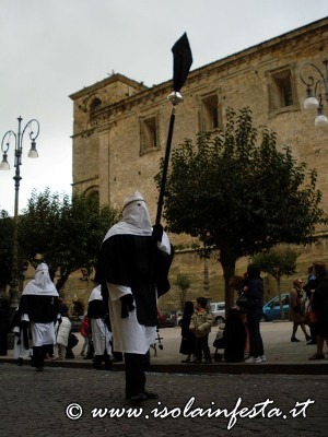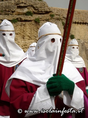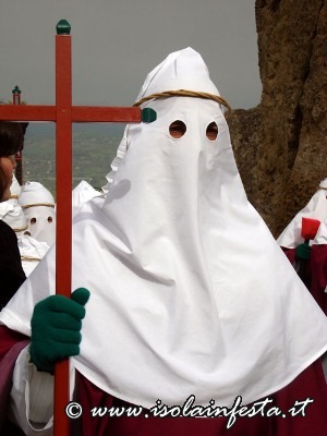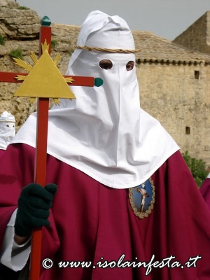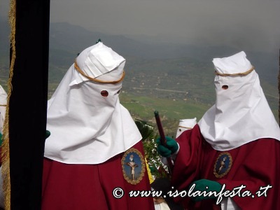 Alle 16:00, dalla chiesa di San Bartolomeo, parte la confraternita dello Spirito Santo alla volta del Duomo. Camice bianco stretto sulla vita da una fascia color verde, con due risvolti a nappe pendenti dal lato destro, mantella in panno di colore amaranto recante a sinistra l’effigie dello Spirito Santo, e guanti verdi.