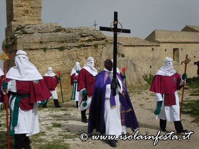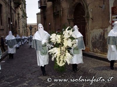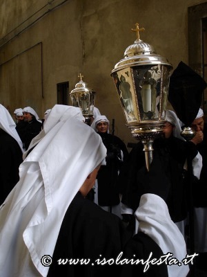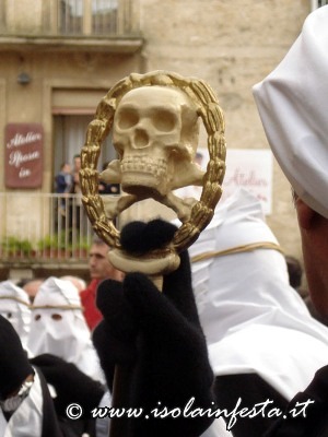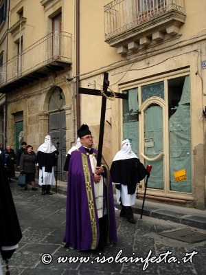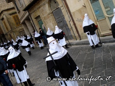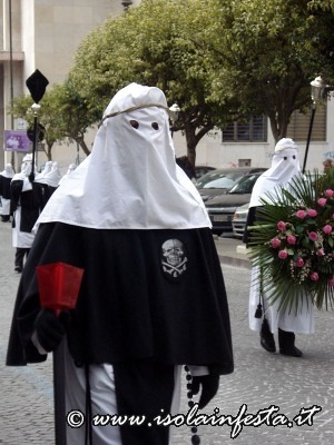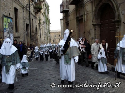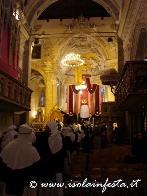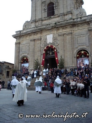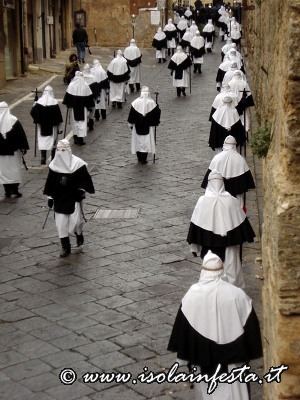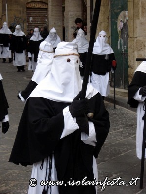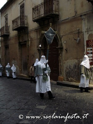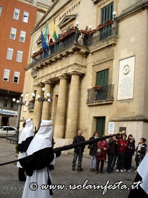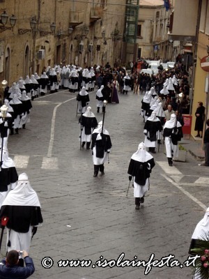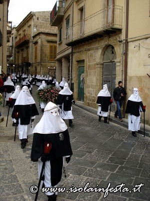 Alle ore 17:00 si reca in Duomo l’Arciconfraternita delle Anime Sante del Purgatorio. Mantella nera, abitino di cotone nero, cingolo intrecciato con filo nero, coroncina composta da dieci sfere nere terminante con una croce snodata nera ed un teschio con le ossa incrociate, e guanti neri. Istituita il 9 ottobre 1615 dal parroco della chiesa di San Bartolomeo, Don Giacomo Pregadio, che proprio in quell’anno fece costruire una cappella dedicata al culto delle Anime del Purgatorio. Fu denominata anche Confraternita della Buona Morte in quanto Carlo IV Re di Spagna la investì dei poteri di assistere i condannati alla pene capitale, e di liberarne tre il 2 novembre di ogni anno. In virtù dei titoli “Venerabile” e “Lata” che le furono attribuiti dal Vicerè di Sicilia nel 1712, fu chiamata “Arciconfraternita”.