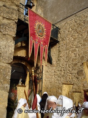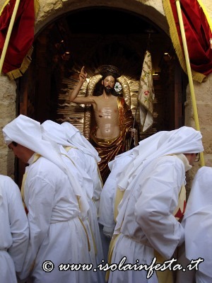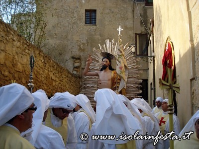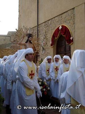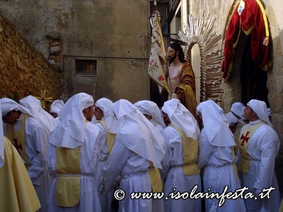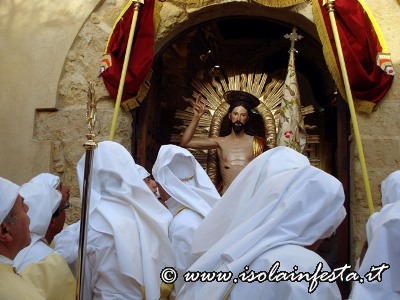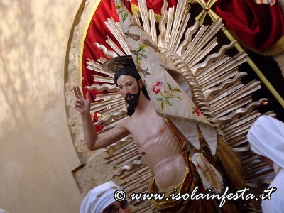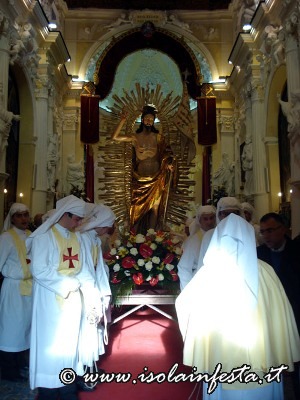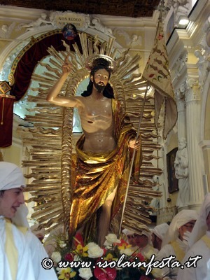 La Madonna, che fa parte del gruppo statuario della Sacra Famiglia che viene portato in processione il 19 marzo per la festa di S. Giuseppe, viene coperta da un velo nero che cade quando si intravede, in fondo alla piazzetta S. Paolo, il Cristo Risorto. Prima dell’incontro dei due simulacri vi è la corsa della bandiera del SS. Salvatore verso la Madonna , e della bandiera della confraternita di San Giuseppe verso Gesù Risorto. Poi, di corsa la Madonna va verso il Figlio Risorto e gli cade il velo nero. Successivamente, al festoso suono delle campane del Duomo, dopo l’incontro, i due simulacri portati dai confrati, con veloce andatura ed a passi cadenzati in avanti e indietro, si affiancano ed entrano in Duomo, dove restano per una settimana sino alla Domenica in Albis. Nel giorno di Pasqua i panifici arricchiscono le loro vetrine, e sembra quasi che sia un’artistica esposizione di pecorelle alla pasta di mandorle e pane con uova. Tutto si lega con il sacro, e anche questa è un’antica tradizione ennese.