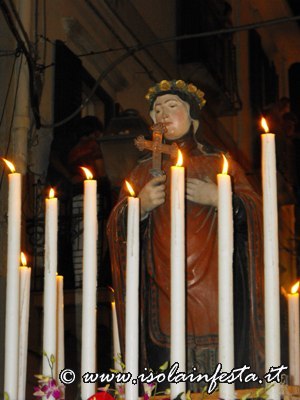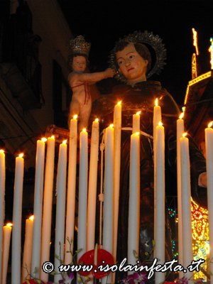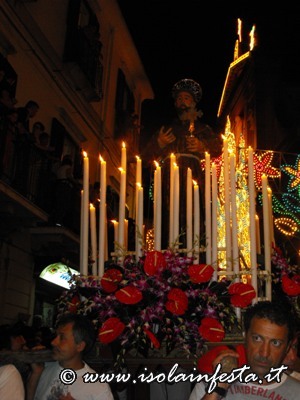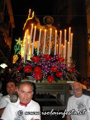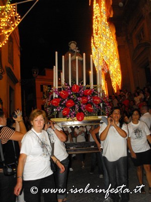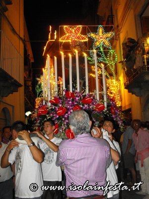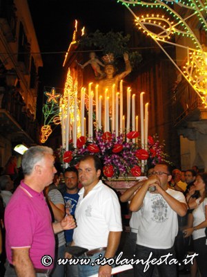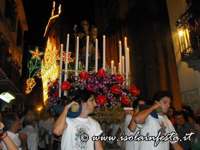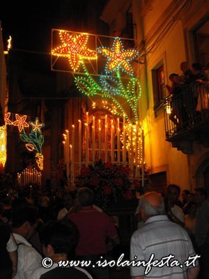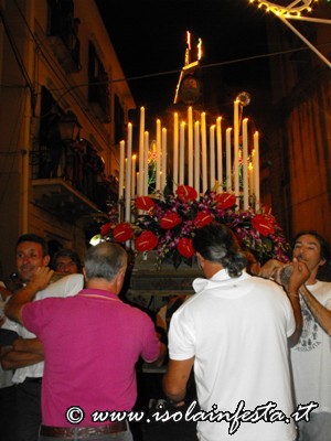Dopo i fuochi d’artificio la processione riprende intorno alle ore 1,00 per l’ultimo tratto fino in chiesa madre, tratto molto faticoso, in cui i devoti effettuano un lento avanzamento del fercolo con tre passi in avanti e due indietro.