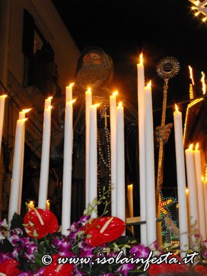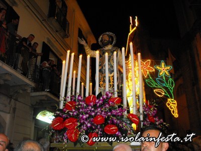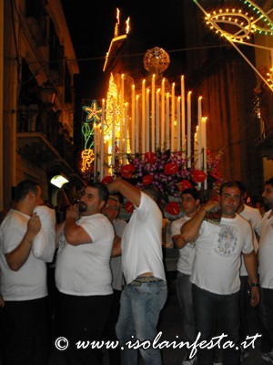 La processione riprende verso le ore 23,00 circa per scendere verso la piazza centrale del paese per un altra sosta di un ora, sostando dalla mezza notte in poi.