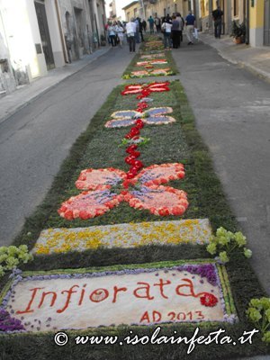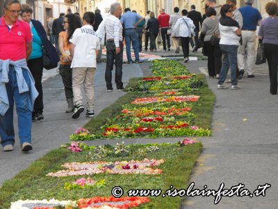 Il sabato mattina il tappeto floreale artistico è completo; nel pomeriggio si passa alla realizzazione dell’infiorata nei rioni del paese, che stavolta non è realizzata dagli artisti professionisti, ma dalla gente comune, che si sbizzarrisce con vari disegni. Alla fine si formerà un tappeto floreale di circa 1800 metri, proprio tutto il percorso della processione del giorno successivo.