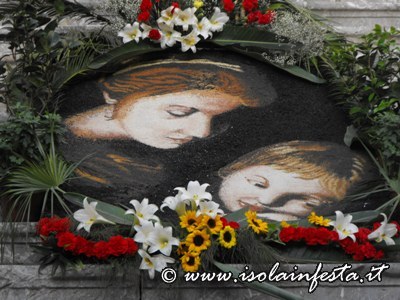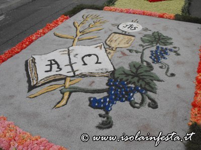 La sera della domenica del Corpus Domini, incomincia alle ore 19,00 la solenne processione di Gesù Sacramentato, che percorrerà tutte le strade infiorate, passando proprio sopra il tappeto di fiori, con al termine della processione passando per l’infiorata artistica. I balconi delle strade vengono addobbati con varie coperte ricamate come da antica tradizione.
