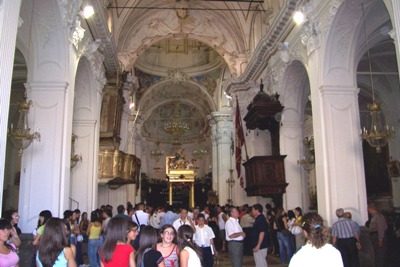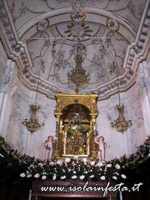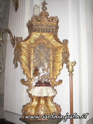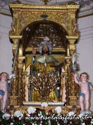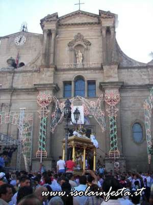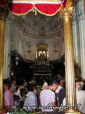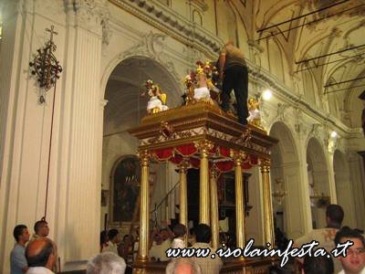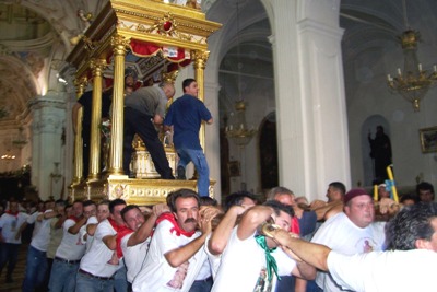 Per svariate volte i portatori corrono dall’altare al portone della chiesa, tentando di far passare la vara dritta e cercando di non urtarla con gli stipiti del portale, essendo questo più basso rispetto al fercolo. Così il Santo più volte si affaccia sulla piazza, e subito rientra correndo verso l’altare. In queste delicate fasi, non mancano gli urti della vara contro i battenti del portone o contro lo stesso portale, colpi che purtroppo danneggiano la struttura del fercolo e gli angeli che decorano la parte superiore. Durante le brevi soste tra una corsa e l’altra, cominciano le offerte dei devoti. Le donazioni in denaro vengono appese nei drappi che abbelliscono gli architravi del fercolo, mentre candide tovaglie d’altare ricamate,  sono avvolte alle colonne o agli angeli. Caratteristica primaria delle offerte al Santo sono le numerosissime provole, che facendo bella mostra di se stesse, pendono dal tetto, e che danno alla vara una connotazione unica.