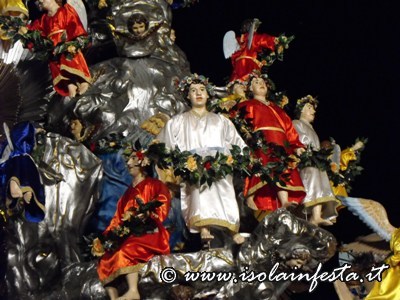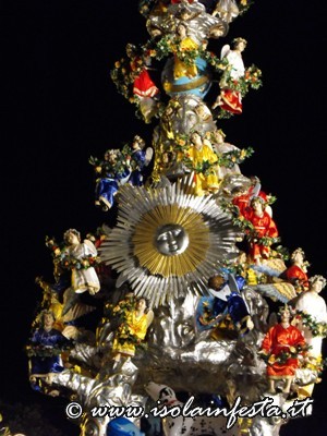 La Vara, alta circa 13,50 metri, poggia su grandi scivoli metallici e presenta numerose figurazioni in materiali diversi di angeli, le due grandi sfere rotanti del Sole e della Luna e, in cima, la statua del Cristo che, con una mano, sorregge Maria, in atto di portarla all’Empireo; i fedeli la trascinano tirando le lunghe gomene (230 m ciascuna, spessore 5 cm) che vi sono attaccate alla base lungo il selciato precedentemente bagnato del corso Garibaldi, da piazza Castronovo a via I° Settembre, e poi da via I° Settembre, arteria storica della Città, fino a Piazza Duomo, dove la processione si conclude a sera.