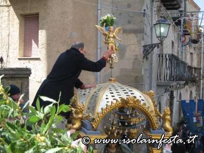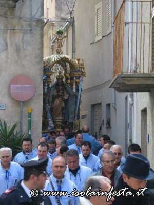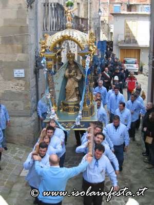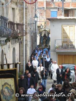 La mattina del 25 marzo si rinnova il pellegrinaggio di tanti ficarresi che vivendo nei paesi vicini raggiungono Ficarra per incontrarsi con la Mamma celeste che li attende e li accoglie sotto il suo manto azzurro. Fino a mezzogiorno si susseguono le celebrazione della Messa nel Santuario (generalmente alle 09.00, alle 10.00 e alle 11.00 quella solenne alla quale partecipano anche le autorità civili e militari). Dopo la Messa delle 11.00 ci si prepara per la processione. Gli uomini, scalzi, si impongono la vara sulle spalle, mentre l’arciprete e i fedeli, inginocchiati al centro della Chiesa intonano il canto dell’Ave Maris Stella e al grido possente dei portatori “Evviva … evviva a Gran Signura Maria” ha inizio la processione che condurrà la Vergine “in gloria, per le vecchie strade di quel vecchio e caro suo borgo”. Ogni processione è per il ficarrese, ma anche per chi viene a vederla, un momento magico dal profondo significato che il poeta Mancuso così descriveva: “È questa l’ora che la Madonna passa in gloria sulla folla e tiene misericordiosamente disteso il suo manto dove raccoglie le miserie e le colpe degli uomini, facendone tante stelle d’oro trapunte sulla seta azzurra”. Il 25 marzo la processione è aperta da due grandi rami si alloro, che alla fine della processione vengono divisi in piccoli ramoscelli ai devoti che numerosissimi seguono la processione, molti dei quali scalzi, manifestando in questo modo la propria devozione alla Madonna. Il corteo è aperto da due ali di ragazzi, segue la confraternita dell’Addolorata e il Gruppo di Preghiera “San Pio da Pietrelcina” facilmente riconoscibili dai loro stendardi. Nei secoli passati erano numerose le confraternite che partecipavano alla processione, oggi purtroppo è rimasta solo quella dell’Addolorata. L’arciprete precede la vara, immediatamente seguita nell’ordine dalle autorità, dalla banda musicale e dietro la folla dei fedeli. La vara percorre un itinerario ben preciso: il corteo si snoda tra vicoli talmente stretti che spesso la vara vi passa a stento. Sui volti dei portatori si possono scorgere i segni della fatica che danno un’idea del pesante fardello che grava sulle loro spalle; nonostante ciò gli uomini si contendono i fortunati istanti “sotto la vara” su cui troneggia la Madonna. Capita spesso di vedere anche dei genitori che poggiano sulla vara i loro bambini, affidando così i figli alla protezione della Vergine dal manto azzurro. Dopo circa un’ora la processione si avvia nuovamente verso il Santuario, dove ancora una volta al canto dell’Ave Maris Stella e al grido di “Evviva a Gran Signura Maria” il simulacro della Vergine viene riposto nella sua cappella da dove continuerà a vegliare sui suoi figli vicini e lontani e dove sarà sempre disponibile per accogliere e ascoltare le suppliche di chi a Lei si rivolge.