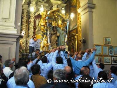 Secondo la tradizione, nell’ottobre 1507 una nave mercantile trasportava un simulacro marmoreo di Antonello Gagini, da Palermo a Siracusa. Il simulacro infatti era stato commissionato per la cattedrale di Siracusa, ma appena la nave giunse nelle vicinanze dello “scoglio di Brolo” si scatenò una tempesta che costrinse i marinai a fermarsi e a scaricare parte del carico della nave, tra cui la cassa contenente la statua della Vergine Annunziata. Cessata la tempesta i marinai cercarono di riprendere il viaggio, ma quando andarono per caricare la cassa contenente la statua non riuscirono più a sollevarla, sembrava come inchiodata alla sabbia. Subito si diffuse la voce tra gli abitanti di Brolo che cercarono anch’essi di sollevare la cassa per portare il simulacro della Vergine nella loro Chiesa, ma invano, perché la cassa rimase immobile. Accorsero allora gli abitanti dei paesi vicini, e si creò come una disputa: chi riuscirà a sollevare da terra il simulacro della Madonna lo porterà nel suo paese. Si alternano così gli abitanti di Piraino, Sant’Angelo, Naso, Raccuia, ma solo quando si avvicinò il clero e il popolo ficarrese e l’arciprete Don Giovanni Sardo intona il canto dell’Ave Maris Stella, ecco che una schiera di ficarresi, fattisi avanti, riescono a caricare sulle loro spalle il simulacro, divenuto come per incanto leggero. Spontanea e ardente l’esplosione di giubilo dei portatori, che con lacrime di tenerezza erompono per la prima volta nel grido, che si ripeterà in seguito in tutte le processioni dell’Annunziata “Viva la gran Signura Maria”.