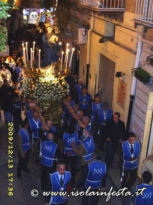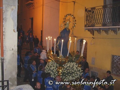 È questo quello che commuove, una lunghissima fila di persone che parte dalla piazza del Carmine avendo grosse torce in mano accese, e rigorosamente a piedi scalzi, cammina sulla strada selciata, arrivando quasi alla Consolazione.